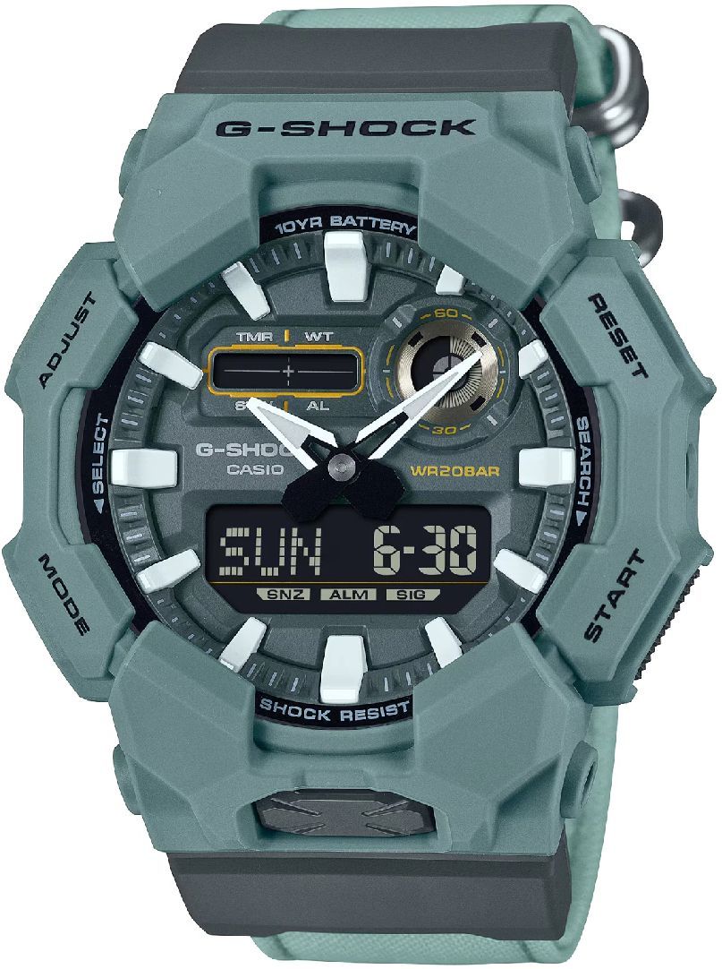 The Casio G-Shock GA-010CE-2A brings bold blue to the GA-010 series with a durable CORDURA re/cor cloth band dyed using food-waste textiles. Built within a carbon core guard case, it combines eco-conscious materials with G-Shock toughness, 10-year battery, world time, LED Super Illuminator, and hand-shift for clear display.