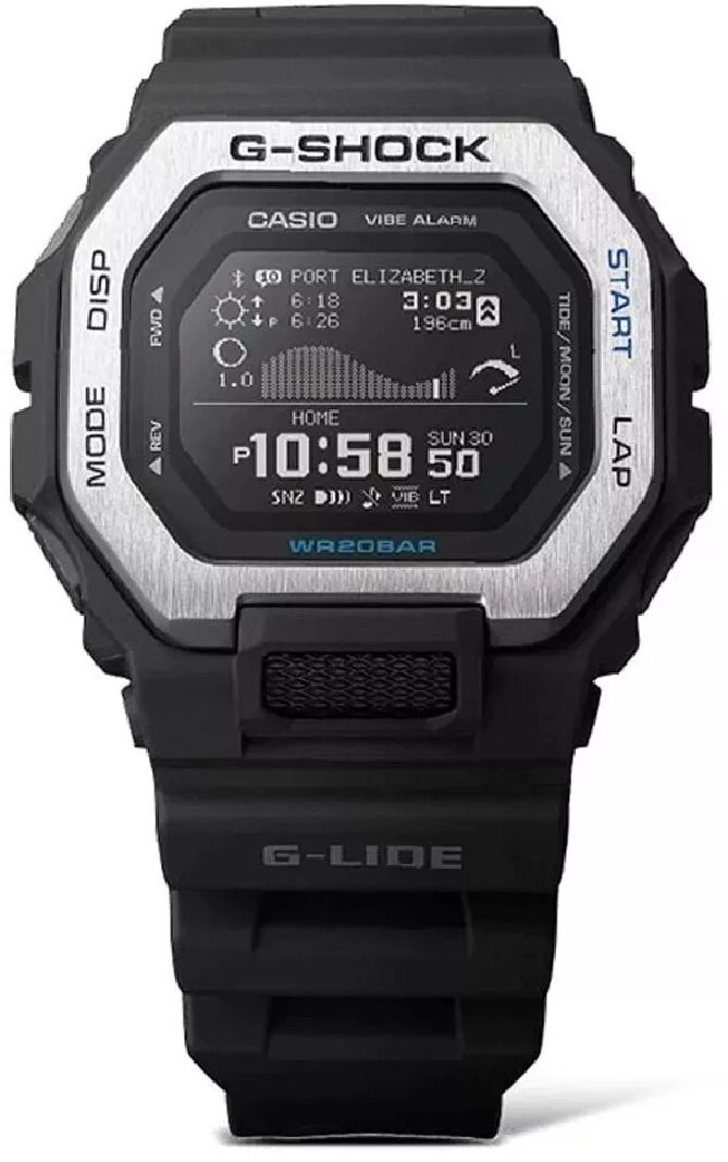 The Casio G-Shock GBX-100-1 from the G-LIDE surf series delivers robust performance with a high-resolution MIP LCD, tide and moon data, sunrise/sunset times, and Bluetooth connectivity. It features a stainless-steel bezel, carbon-core guard structure, and step counterperfect for ocean-focused athletes and outdoor enthusiasts.
