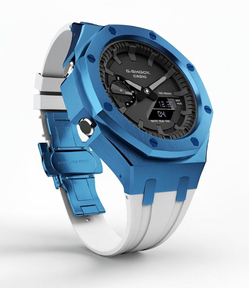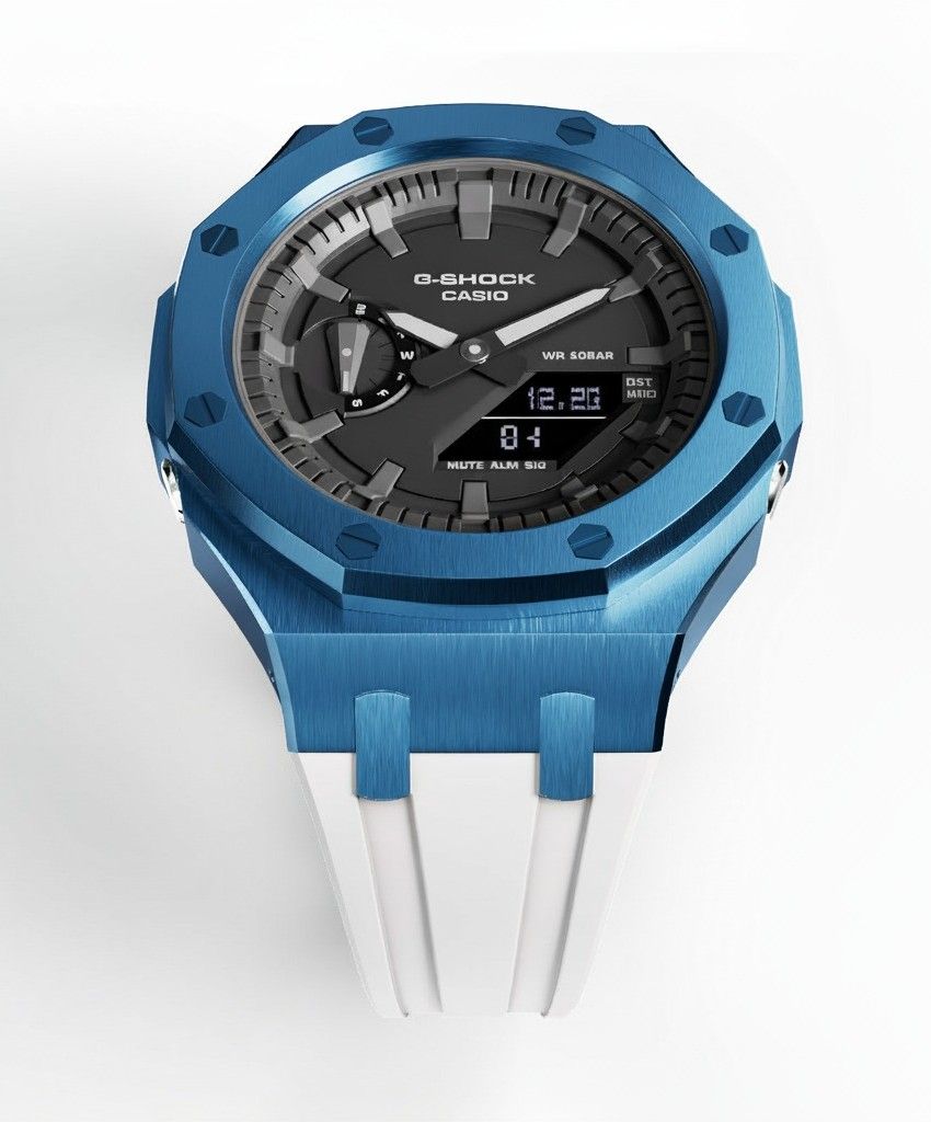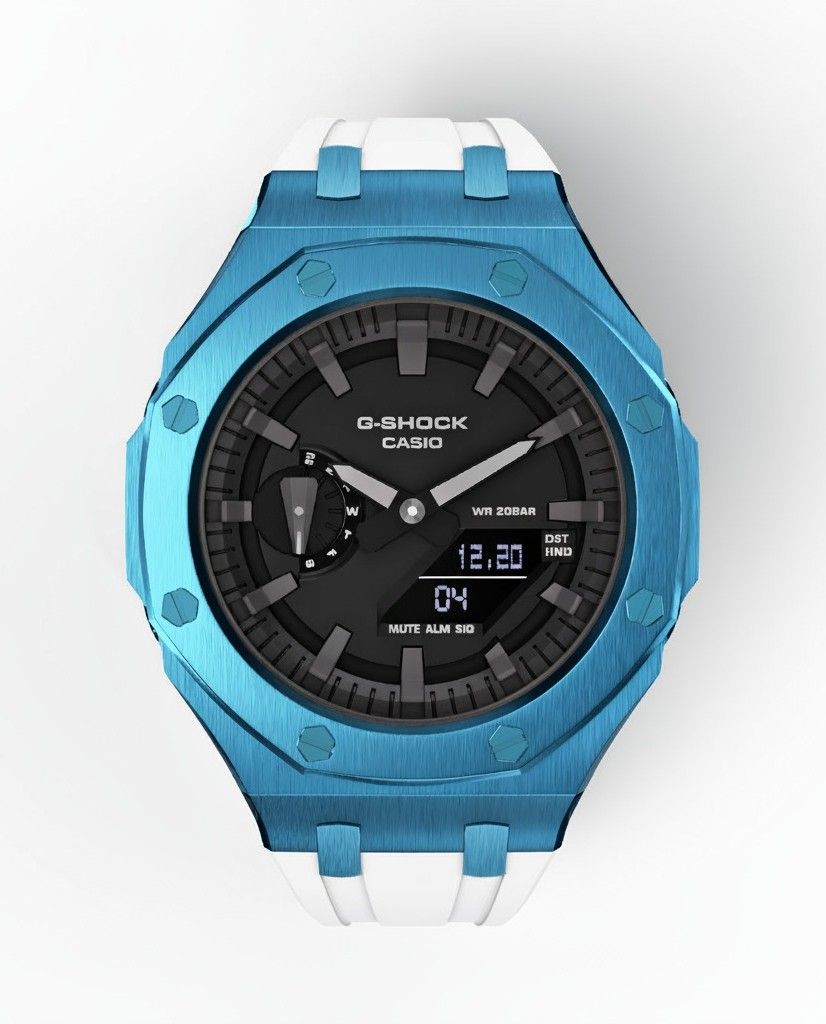 • Casioak Mod Custom Watch Casio G-Shock GA-2100 Blue Case White Silicone Strap
