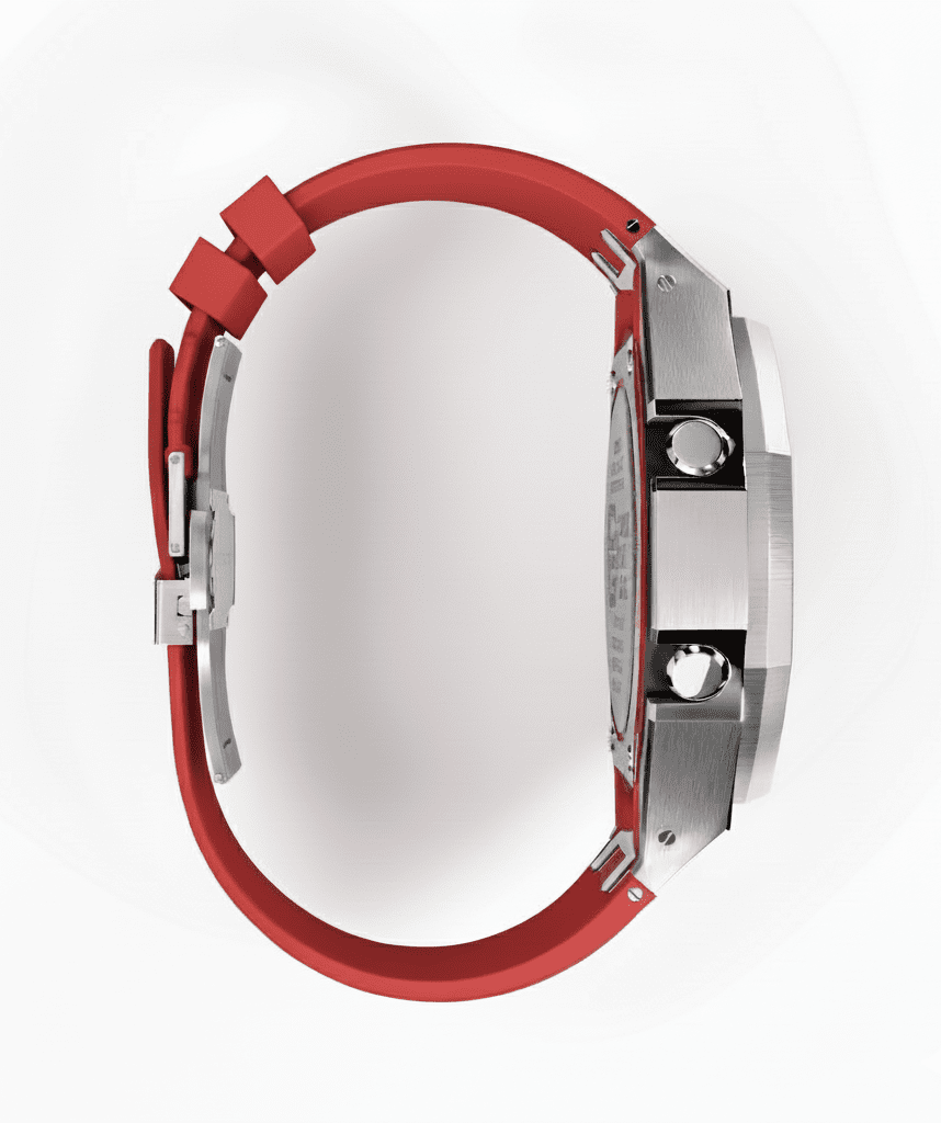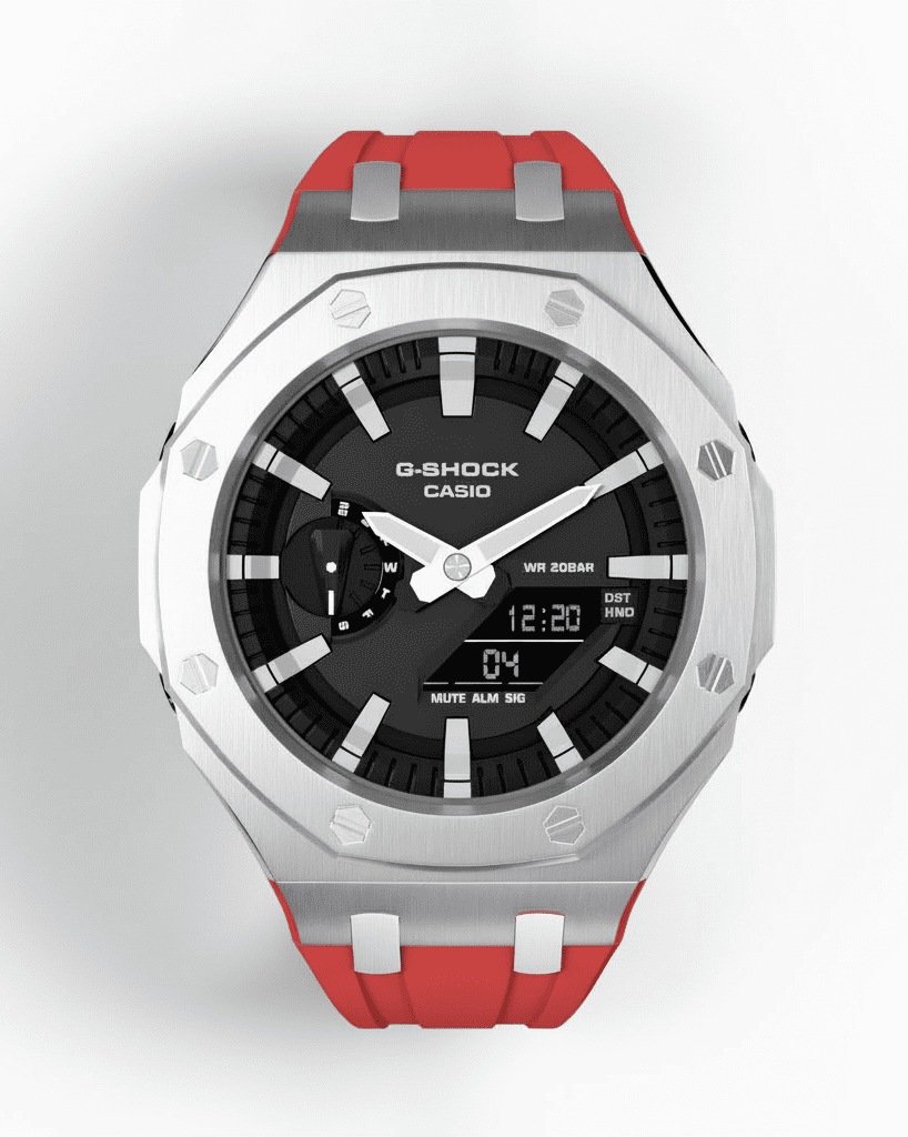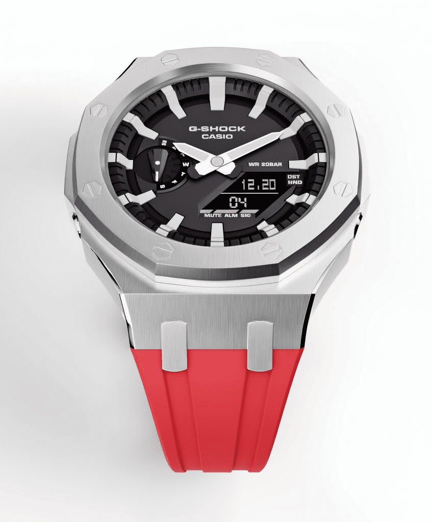 Casioak Mod Watch Casio G-Shock GA-2100 Silver Case Red Strap Modded GA2100-1A